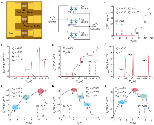 图4. 用于多值逻辑计算的热发射极晶体管电路。a. 电路光镜图;b. 等效电路图;c. 集电极电流作为输出的四值数字逻辑反向器;d. 集电极电流对应的跨导;e.发射极电流作为输出的四值数字逻辑反向器;f. 发射极电流对应的跨导;g. 三值反向器;h.三值跟随器;i. 三值加法器元件。